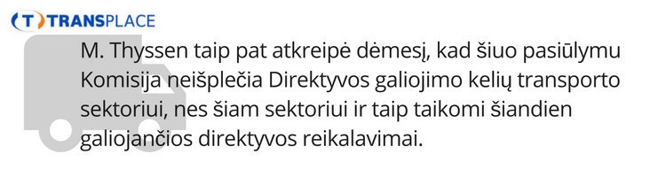 Komandiruojamų darbuotojų veiklą reglamentuojančios taisyklės neturėtų būti taikomos transporto sektoriui dėl jo išskirtinai mobilaus darbo pobūdžio. Bendrųjų taisyklių taikymas transporto sektoriaus tarptautinių reisų vairuotojams, kiekvieną dieną teikiantiems paslaugos keliose skirtingose ES valstybėse narėse, yra nepagrįstas, neįgyvendinamas bei sukursiantis per didelę administracinę ir mokestinę naštą įmonėms bei atitinkamoms priežiūros institucijoms“,- transporto atstovus užgulsiančią naštą įžvelgė E. Mikėnas.