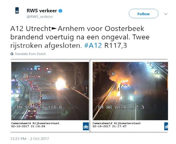 Grėsmingai atrodantis eismo įvykis įvyko praėjusio pirmadienio rytą Olandų greitkelyje A12, netoli Osterbeko, praneša tinklalapis nltimes.nl.