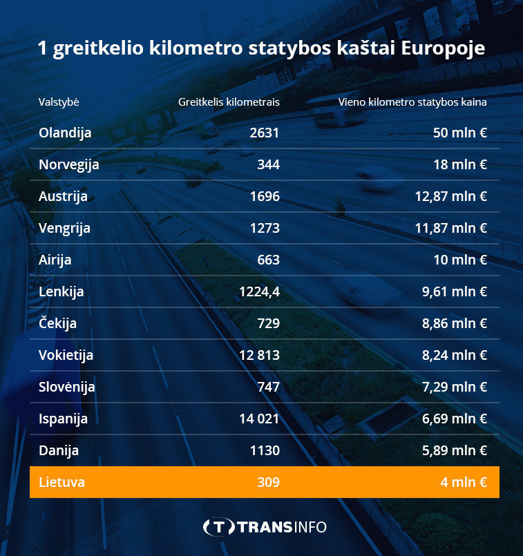 Panašiai greitkeliai kainuoja Danijoje (5,89 mln Eur) ir Ispanijoje (6,69 mln Eur). Mūsų kaimyninėje Lenkijoje 1 kilometro kaina yra jau 2,4 kartus didesnė ir sudaro 9,61 mln Eur. Europos vidurkį stipriai „pakelia“ Olandija, kurioje vidutiniai 1 greitkelio kilometro statybos kaštai sudaro 50 milijonų Eur. Rekordą olandai sumušė statydami A4 greitkelio 7 kilometrų atkarpą, kuri jiems kainavo 1 milijardą Eur!