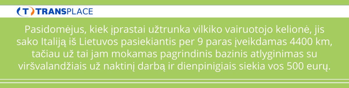 „Realybė tokia, kad Lietuvoje niekas pagal įstatymus atitinkantį darbo užmokesčio skaičiavimą iš esmės niekad nedirba, o gaunant atlyginimą už nuvažiuotus kilometrus (už kilometrą dažniausiai mokama apie 0,11 euro centų) atlyginimas siekia 460 eurų“, – pasakoja Vincas.