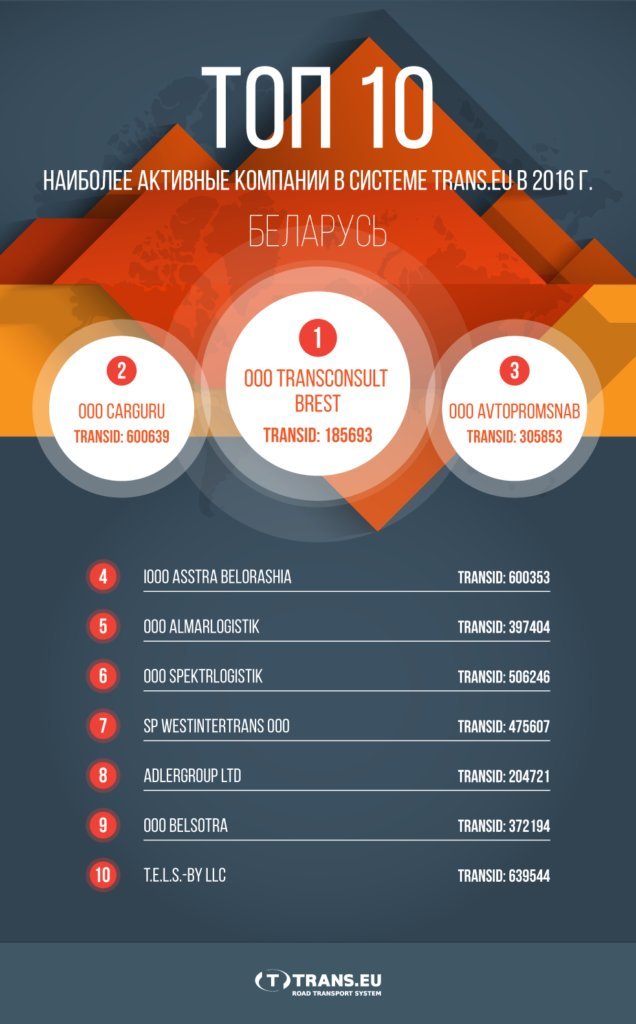 Džiaugiamės, kad Trans.eu Sistemoje dirba 34 iš 50 aukščiau išvardytų įmonių, o dalis jų taip pat atsirado Trans.eu Sistemos aktyviausių baltarusiškų įmonių reitinge už 2016 metus.