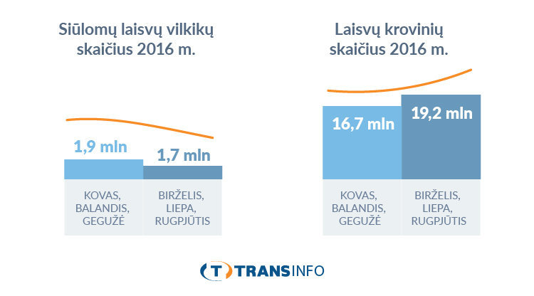 Trans.eu sistemos duomenimis, 2016 m. birželio ir liepos m. biržoje užregistruota 1,20 mln laisvų automobilių, o krovinių -12,63 mln, 10 kartų daugiau, negu automobilių.