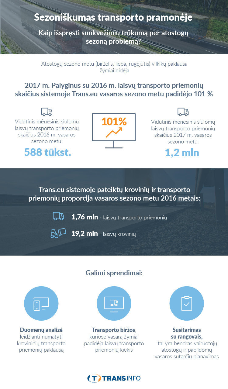 Kelių transportas visada buvo priklausomas nuo sezoniškumo. Šioks toks nuosmukis jaučiamas jau metų pradžioje, kai po švenčių mažėja užsakovų. Vis dėlto sunkiausias būna vasaros sezonas, kurio metu siuntėjas turi problemų su transporto paieška. Problema vis didėja, bet galima ją išspręsti.