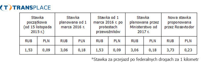 Pamiętamy o tym, że na początku roku postanowiliśmy wydłużyć okres, podczas którego stawki za przejazd miały wynosić 1,53 rubla (0,09 zł.). Miało to na celu sprawdzenie, czy system działa normalnie. I funkcjonuje normalnie”, – zauważył minister M. Sokołow.