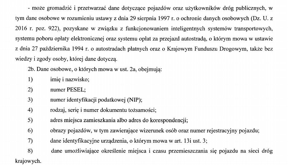 – Wg mediów, projekt ma pozwolić nieokreślonym organom na zbieranie szczegółowych danych, pozwalających na ustalenie czasu i miejsca poruszania się każdego samochodu. Nie tylko ciężarówek. Zaangażowane podmioty będą miały dostęp do takich informacji jak: imię i nazwisko, PESEL, rodzaj, seria i numer dokumentu tożsamości czy adres zamieszkania. System ma rejestrować także obrazy pojazdów, umożliwiające identyfikację pasażerów i odczytanie numeru rejestracyjnego – wyliczaliśmy na łamach TransPlace.