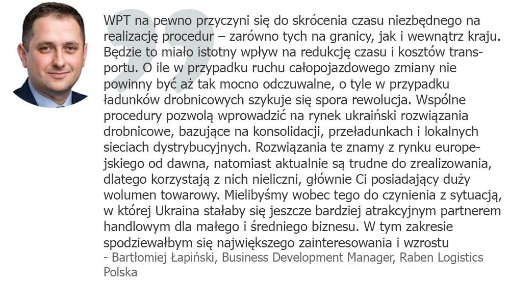 Jak twierdzi Bartłomiej Łapiński, Business Development Manager ze spółki Raben Logistics Polska, zapowiedź prac nad wdrożeniem Wspólnej Procedury Tranzytu przez Ukrainę to dobra wiadomość dla wszystkich uczestników łańcucha dostaw. Obecny system, pomimo licznych zmian i uproszczeń, wdrożonych w ostatnich latach, pozostaje jednym z najmniej przyjaznych i najbardziej uznaniowych na całym kontynencie Eurazjatyckim.
