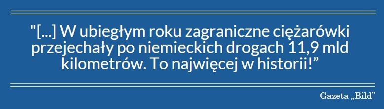 W ten sposób gazety opisywały coraz większą obecność zagranicznych przewoźników na niemieckich rynku. Dziś już 40 proc. ruchu ciężarowego w Niemczech generują pojazdy na obcych tablicach a ich udział stale się zwiększa.