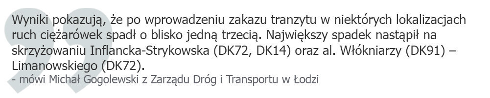 Od 17 października 2016 roku ciężarówki o DMC powyżej 12 ton mają zakaz wjazdu do Łodzi. Tamtejsze władze podają, że od tego czasu liczba ciężkich pojazdów w mieście spadła nawet o 30%. Efekty już są widoczne – ruch w mieście odbywa się płynnie, a korków jest coraz mniej.