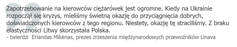 Dodaje, że brak kierowców to główny powód, dlaczego litewskie firmy przewozowe nie mogą się należycie rozwijać.