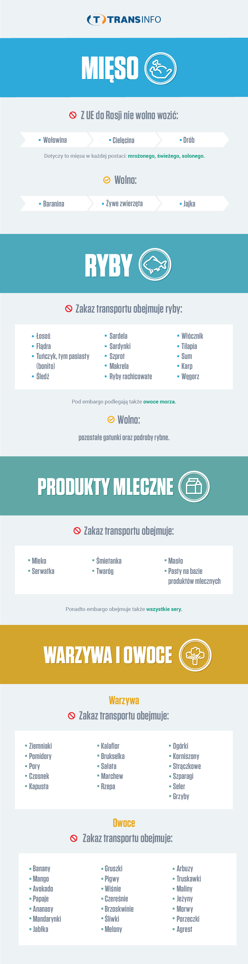 Najbardziej ucierpiały dostawy, ponieważ mięso, mleko, ryby i inne produkty trafiły na listę produktów, objętych embargiem. Zgodnie z danymi rosyjskiej służby celnej, objętość transportu tego rodzaju produktów spadła o 83,3 proc. Przewóz tych towarów nie osiągnął wyników zerowych tylko dzięki niektórym produktom, które cudem uniknęły “czarnej listy”: żywym zwierzętom, baraninie, jajkom itp. Zresztą nawet i te towary wozi się do Rosji o wiele mniej, niż kiedyś.