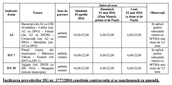 Compania Naţională de Autostrăzi şi Drumuri Naţionale din România SA anunţă participanţii la trafic că potrivit prevederilor HG nr. 1777/2004 cu modificările şi completările ulterioare, circulaţia vehiculelor, altele decât cele destinate exclusiv transportului de persoane, este interzisă în zilele de sâmbătă 30 Aprilie, duminică 01 Mai şi luni 02 Mai 2016 (1 Mai, prima şi a doua zi de Paşti) şi în intervalele orare conform Anexei nr. 1 la Hotărâre, după cum urmează: